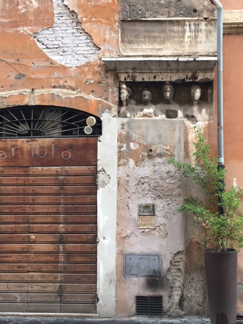 Everything I love about Rome in one picture. The worn, gritty look of a city that wears its centuries nonchalantly, a 2000 year old Roman relief removed from a family tomb outside the city, and pasted on this building by the admirer of antiquities who lived here long ago; electric cables draped across it, a drainpipe, the wooden door of a cafe’. Past and Present, Art and Daily Life.