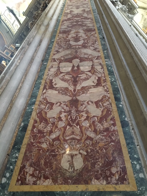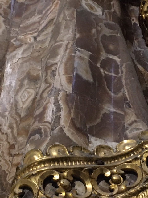 The technical ability that allows carefully placed alabaster tiles to suggest the folds of heavy fabric sends my mind back to the marble wings of the angel on the Sant’Angelo bridge. I marvel at the work of human hands (no power tools here!), and the attention to detail in every corner of Rome’s churches, even in the symmetrical, open-book effect of the marble on this pilaster that looks like a Technicolor Rorschach test…
