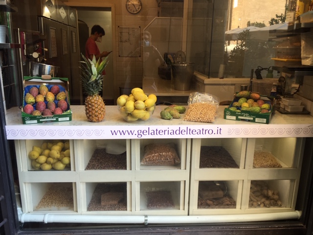I walk in the direction of Via dei Coronari and indulge in the happiness of sifting through everything I see for details that speak of Rome in a gentler, more intimate manner: an outdoor table waiting for good food and good company, the window of a favorite gelato shop – Il Teatro – with ingredients on display (what could be paired with prickly pear?), and an exhortation I make my own as I wander through here.