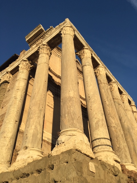 A closer look reveals that the fragments represent only “extremities” of the body: head, hands, feet. To have an actual experience, we must do two things that require our imagination: reassemble the pieces that are lying in this courtyard, integrate what is gone so as to visualize it intact, and “set it free” by picturing the statue in its original location, where the Romans, whose ruler Constantine was, saw it. This statue represented the emperor in a sitting position and it was about 30 feet tall. No other pieces were found so it might not have all been made of marble but of other, more perishable materials that did not survive. It stood (or sat!) in the Basilica of Maxentius and Constantine (now included in the area of the Roman Forum), a great, marble-clad- hall that measured 265x 83 feet and was 115 feet high. According to recent scholarship, it was used mostly by the prefect of Rome for administrative purposes.